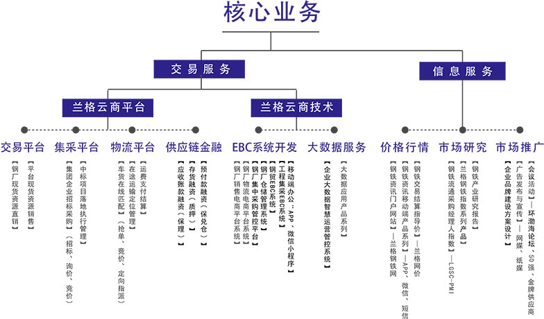 經(jīng)過二十余年的發(fā)展,蘭格集團(tuán)成功打造出集交易服務(wù)和信息服務(wù)于一身、解決方案和技術(shù)支持兩手抓的綜合服務(wù)體系。該體系涵蓋了以價格行情、市場研究、市場推廣為主體的全方位信息服務(wù)平臺;以交易、物流、集采、金融為服務(wù)方向的全方位電子商務(wù)平臺;以EBC系統(tǒng)開發(fā)和大數(shù)據(jù)服務(wù)為核心的技術(shù)支持解決方案,最大程度滿足了鋼鐵生產(chǎn)、貿(mào)易、采購等不同企業(yè)的多元化需求,為用戶提供了全方位、一站式的貼心服務(wù)。
