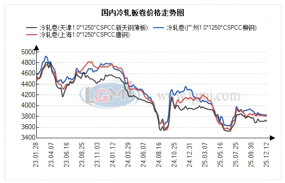 本周(12.8-12.12)國(guó)內(nèi)冷軋市場(chǎng)價(jià)格弱勢(shì)下行。據(jù)蘭格鋼鐵云商平臺(tái)監(jiān)測(cè)統(tǒng)計(jì),國(guó)內(nèi)1.0mm冷卷均價(jià)3817元,較[詳細(xì)]